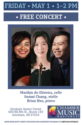 Join Gresham Senior Center for a Free Concert with Chamber Music Northwest on Friday, May 1st from 1:00pm to 2:00pm at the Gresham Senior Center.